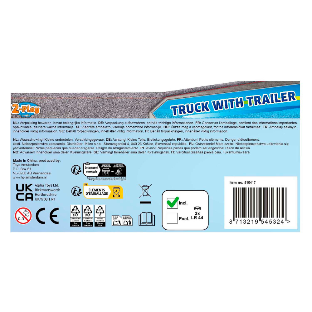 Deze stoere vrachtwagen met oplegger van 38 cm zorgt voor realistisch speelplezier. Dankzij de licht- en geluidseffecten lijkt het net een echte truck. De deuren kunnen open voor extra speelmogelijkheden en door de frictie-aandrijving rijdt de vrachtwagen soepel vooruit. Klaar voor het volgende transport?