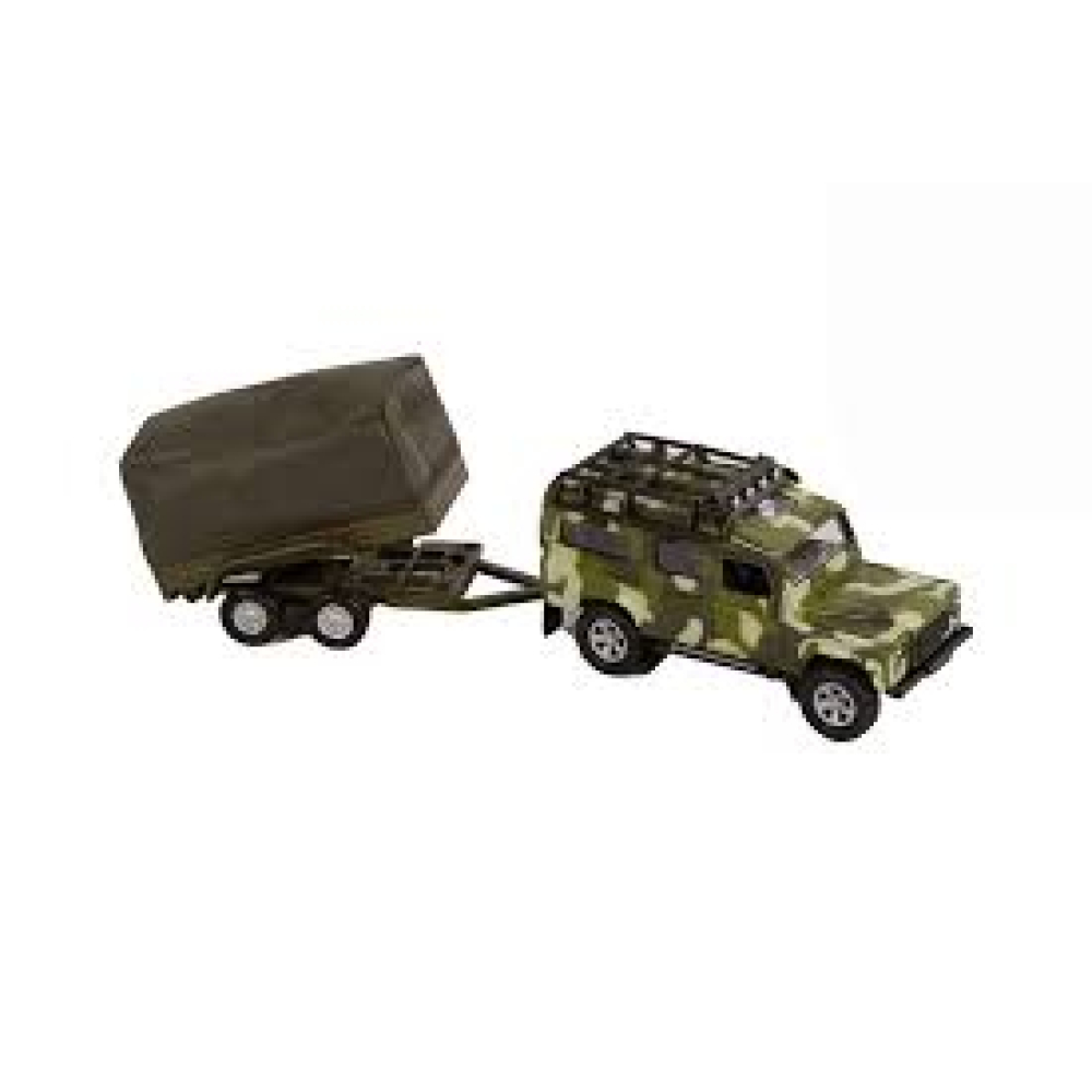 De groene speelgoed auto wordt in camouflage kleuren geleverd; dit is om de auto minder op te laten vallen in het veld of het bos. De auto zelf is een sterke Land Rover Defender met een 4 wiel aandrijving, geschikt voor ieder terrein.