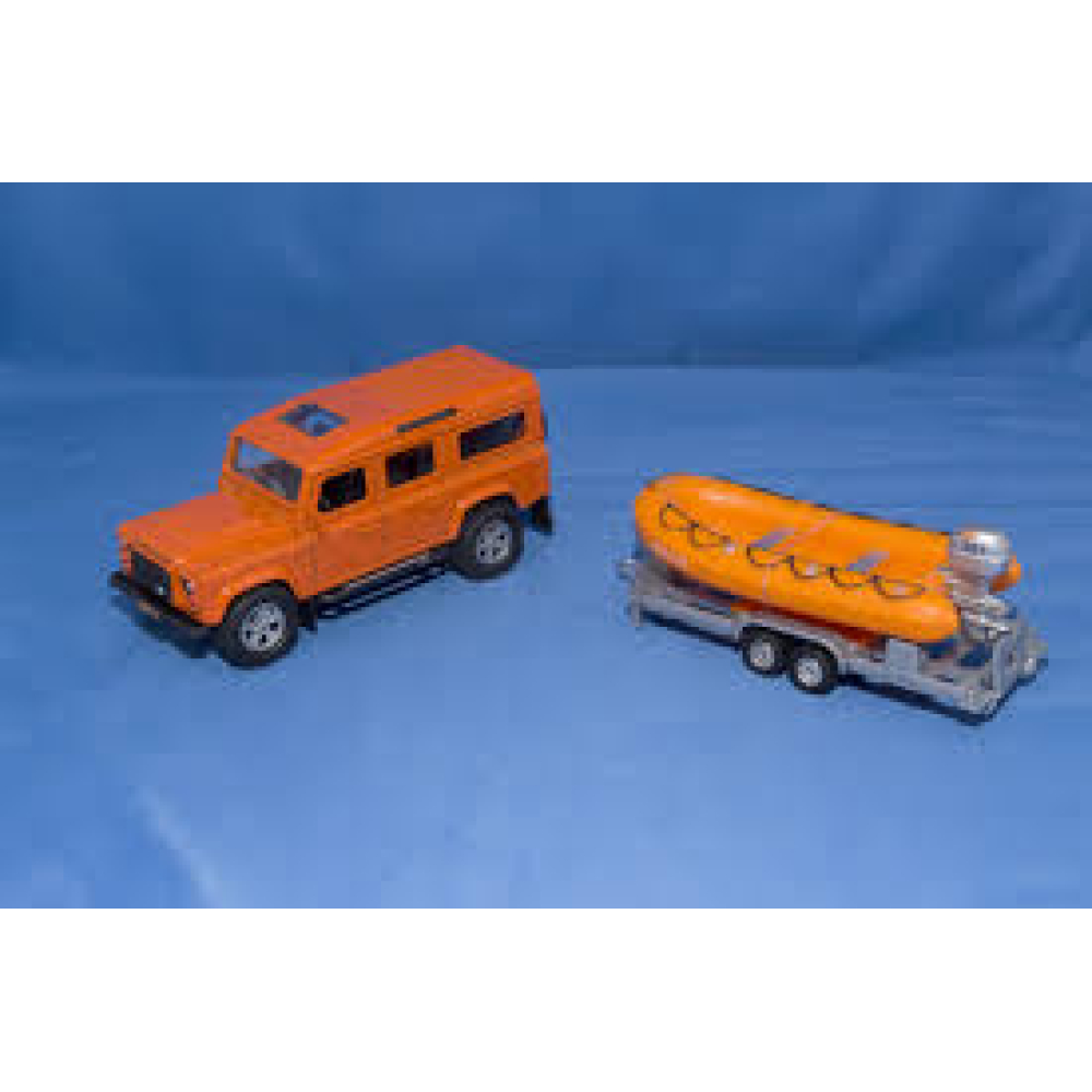 Die Cast pull back Landrover Defender met reddingsboottrailer