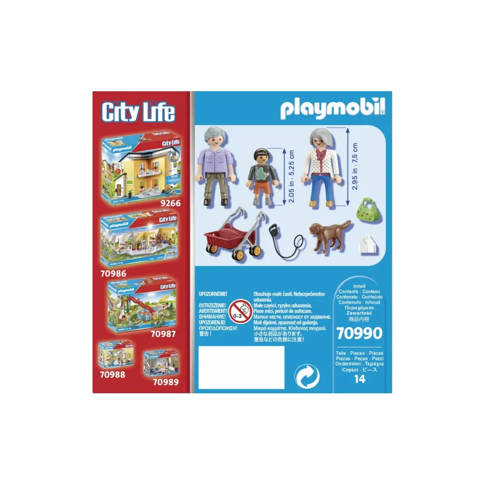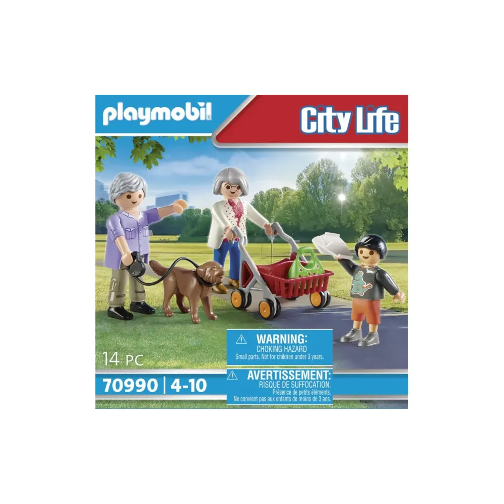 De set bevat twee grootouders en een kinderfiguur, een hond, een papieren vliegtuigje, een rollator en andere extra's.