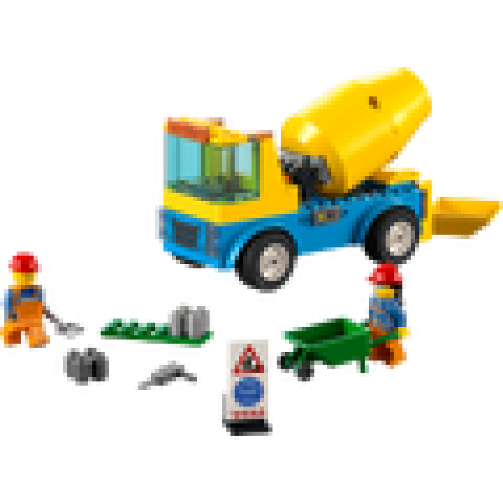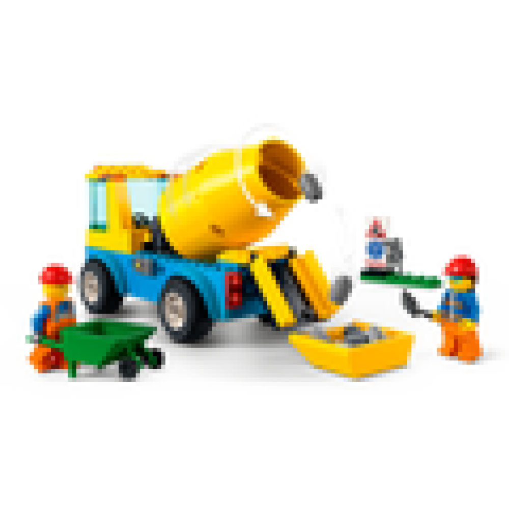 - Wat zit er in de doos – alles wat kinderen nodig hebben om de LEGO® City Cementwagen te bouwen, plus een kruiwagen, drilboor, bord voor wegwerkzaamheden en 2 minifiguren van wegwerkers