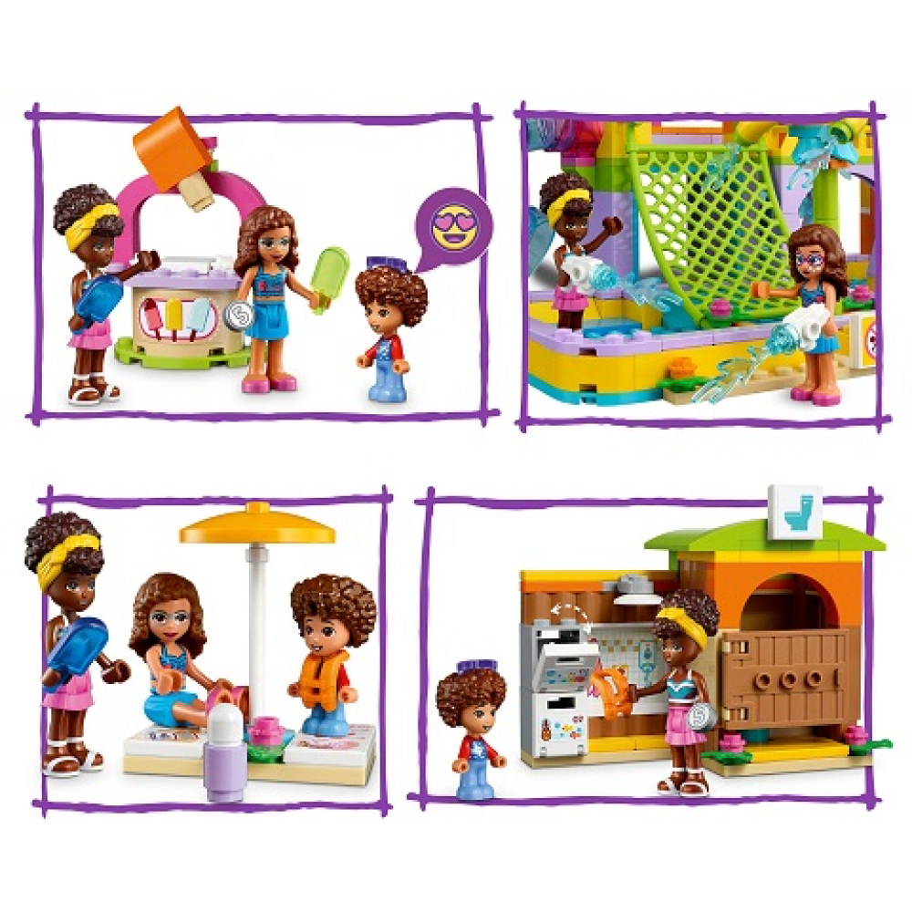 Er zijn een heleboel realistische functies om te ontdekken, zoals 2 glijbanen, een octopus die water spuit, een watervaldouche en een grot met een aquarium. Naast alle spetterende actie is er ook nog een kleedkamer compleet met douche en toilet. Samen met LEGO Friends minipoppetjes van Olivia, Nandi en Santiago uit Heartlake City kunnen kinderen lekker afkoelen met een ijsje bij de ijskraam en uitrusten onder de parasol.