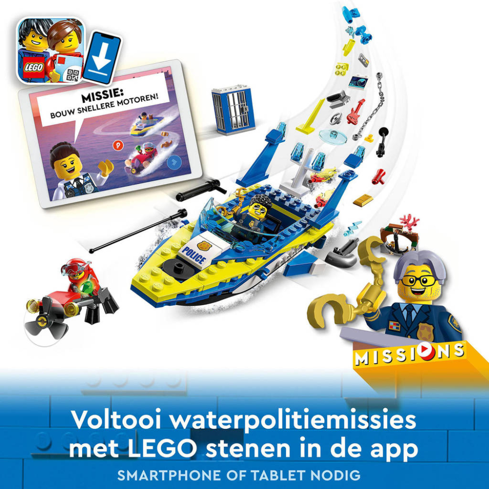 Dit bouwbare LEGO spel bevat een razendsnelle speelgoed speedboot, een gevangeniscel voor de boeven en 4 leuke minifiguren, waaronder politieagenten en het populaire personage Duke DeTain uit de tv-serie LEGO City Adventures. Kinderen spelen de hoofdrol in spannende digitale verhalen, wanneer ze de politie helpen om achter de boeven aan te gaan.