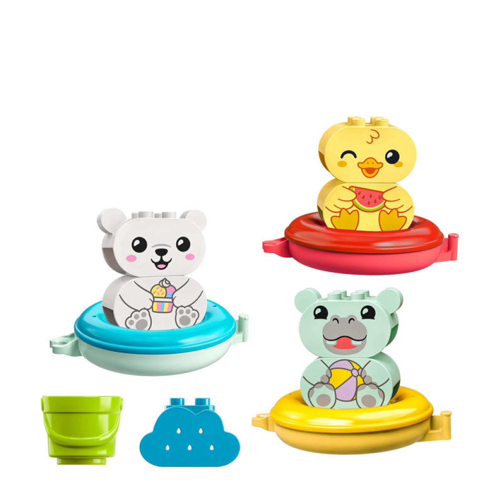 Zorg dat je peuter met plezier in bad gaat met dit leuke drietal van een nijlpaard, eend en ijsbeer. De 3 dieren zitten in verschillend gekleurde drijvende ringen. Er is een emmer om de dieren te wassen en een wolk die voor regen zorgt. Door de ronde haken kunnen kinderen de ringen eenvoudig aan elkaar vastmaken en weer losmaken, of deze bevestigen aan de ringen van de Pret in bad: drijvende rode panda (10964) en het Pret in bad: drijvend diereneiland (10966) (sets apart verkrijgbaar). En omdat de ringen open kunnen, zijn ze gemakkelijk hygiënisch schoon te houden – bad na bad.