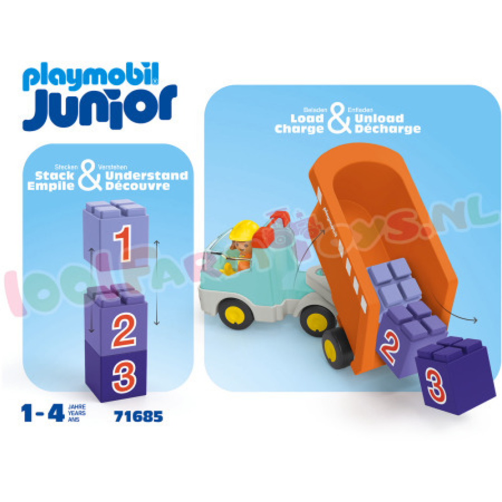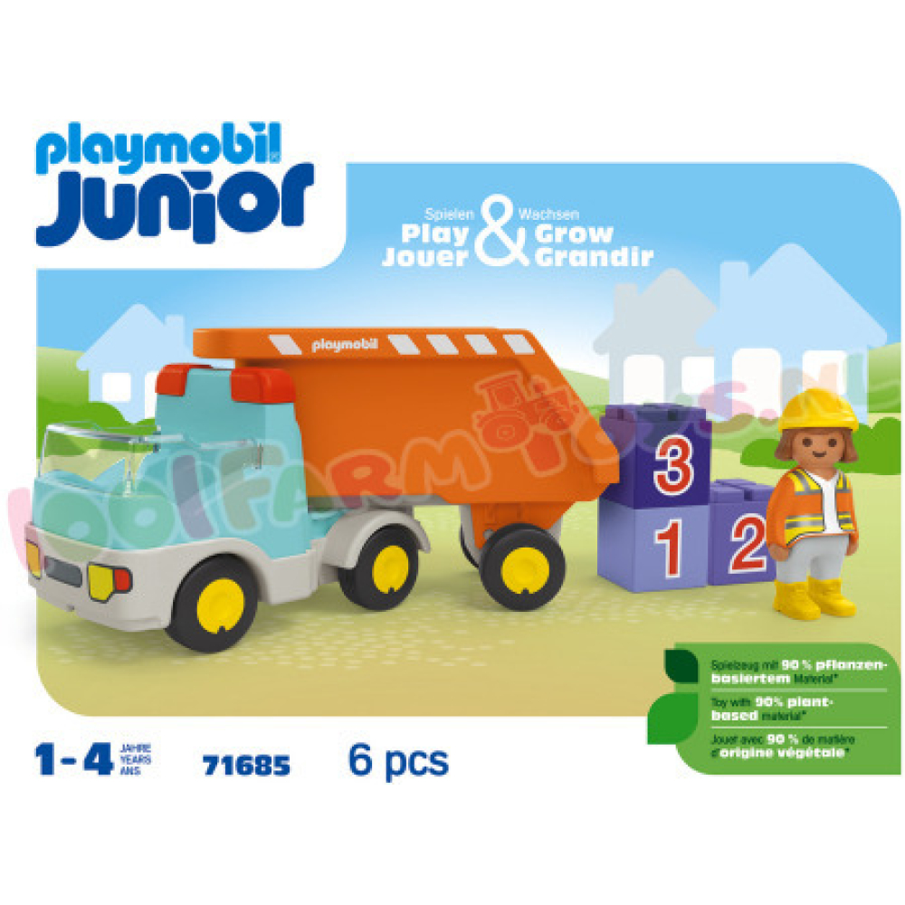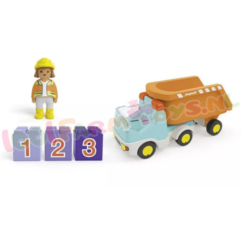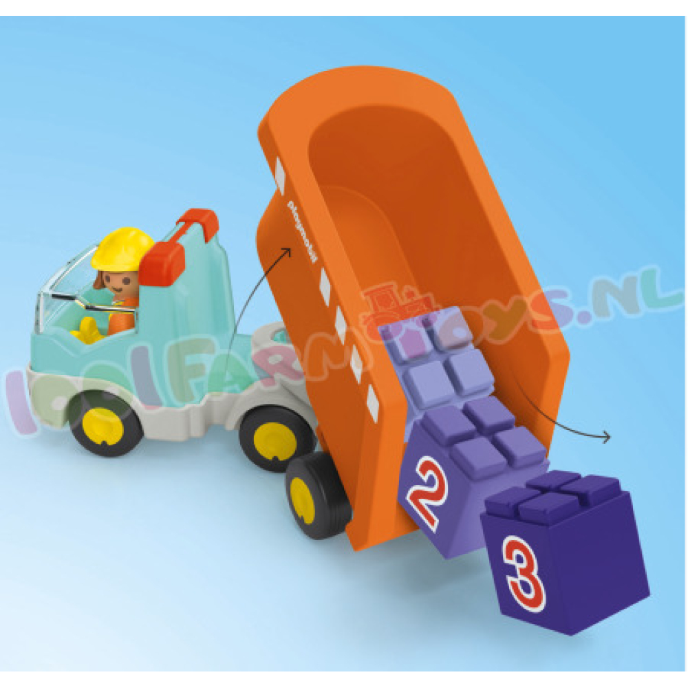 Figuren: 1 vrouw Accessoires: 1 kiepwagen. 3 bouwstenen
