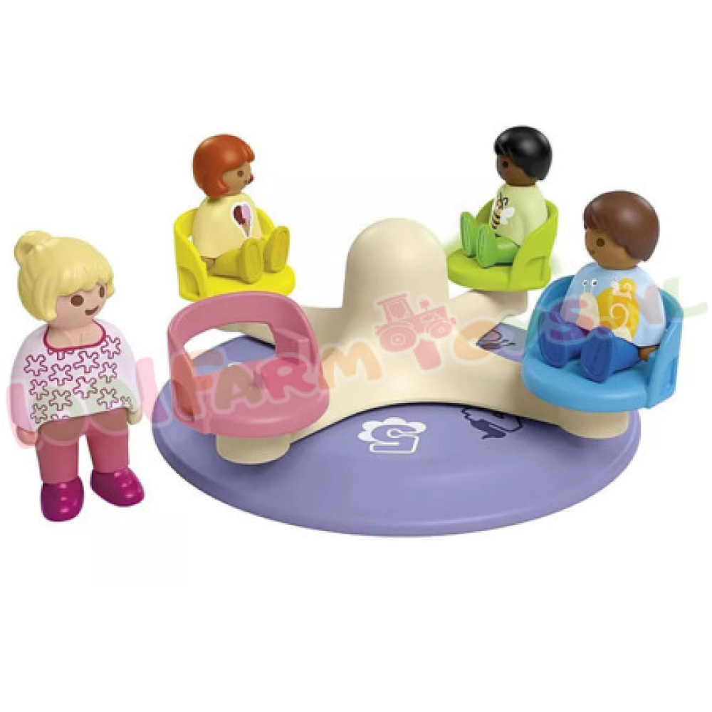 Figuren: 1 vrouw. 2 jongens. 1 meisje Accessoires: 1 draaimolen met 4 zitplaatsen