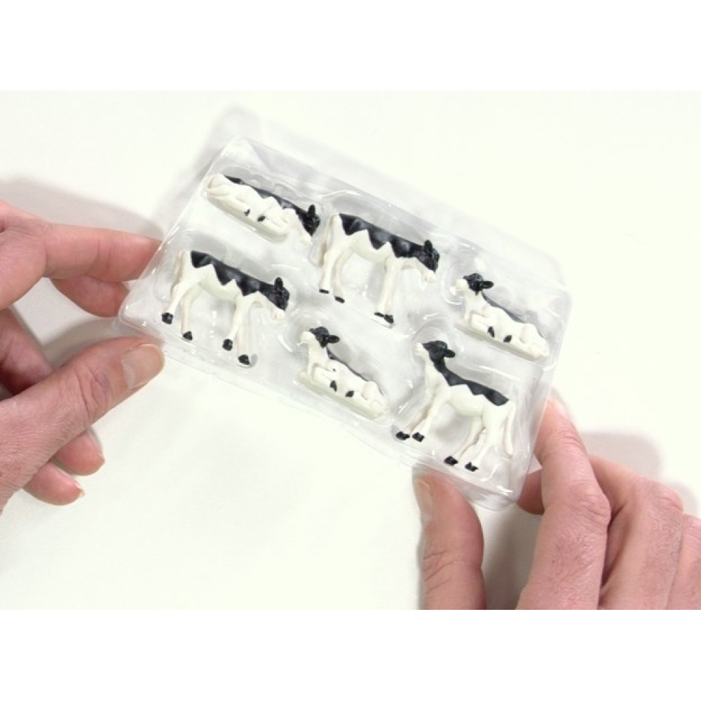 De kalfjes zijn verpakt met 3 staande en 2 liggende kalfjes. De kalveren passen zowel op een diorama als speelgoedboerderij.