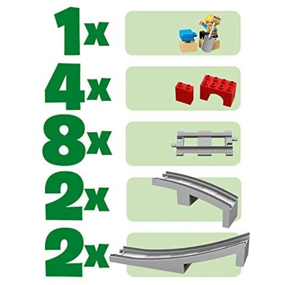 Voeg deze LEGO® DUPLO® set 10872 Treinbrug en -rails toe aan een willekeurige nieuwe of bestaande DUPLO treinset en laat je peuter of kleuter de eerste bouwvaardigheden ontwikkelen terwijl hij of zij de hoge brug bouwt en de treinrails naar eigen inzicht neerlegt. Help je kind om de gele actiesteen op de rails te leggen, zodat de compatibele DUPLO treinen toeteren als ze eroverheen rijden. Inclusief een LEGO DUPLO figuur van een bouwvakker, 2 losse stenen, een schep en een koffer voor nog meer mogelijkheden voor rollenspel en om allerlei verhalen mee te verzinnen.