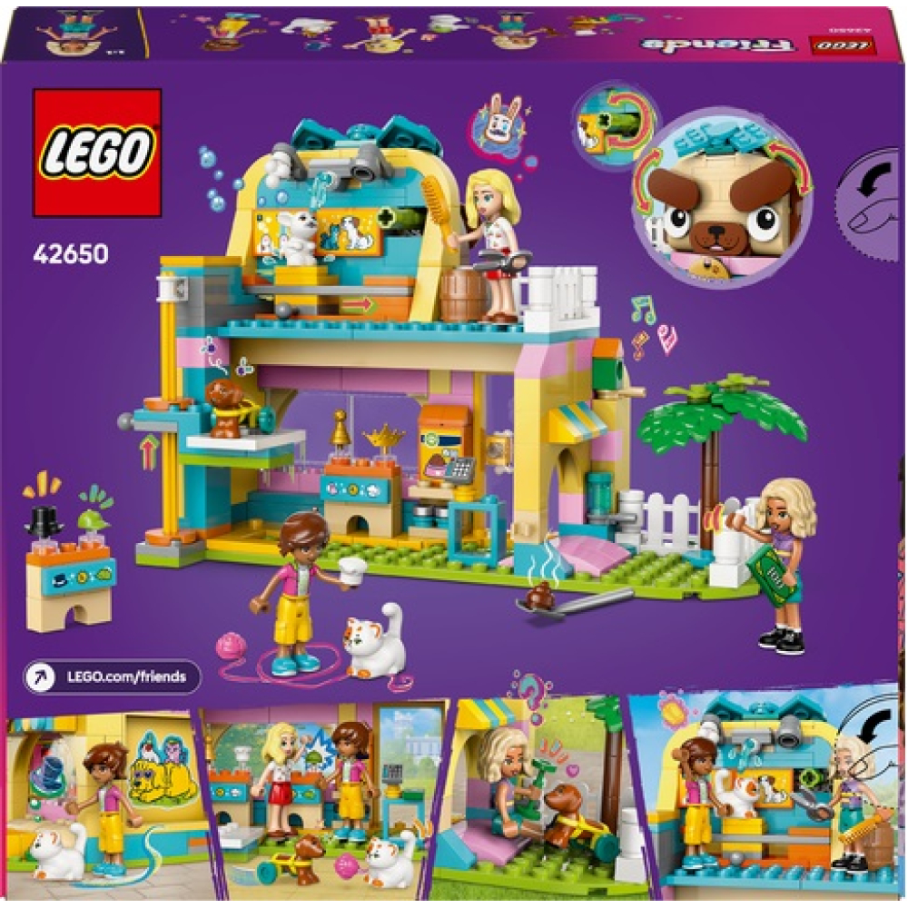 Ga samen met LEGO Friends Nova, Leo en Matilde op zoek naar nieuwe hoeden en accessoires voor hun dierenvriendjes Churro, Gurkie en Amos. Breng de huisdieren met de lift naar de verzorgingsruimte, waar ze via een transportband door de inzeep-, was- en droogstations worden geleid. Bekijk de accessoires, waaronder een koksmuts, baseballpet en bolletje wol. Er is ook geld en een kassa. Pas op voor de hondenpoep! Gelukkig is er een schep om het op te ruimen! Ontdek meer grappige details, zoals het ontwerp van het gebouw in de vorm van een hond, compleet met beweegbare wenkbrauwen en draaibare strik.