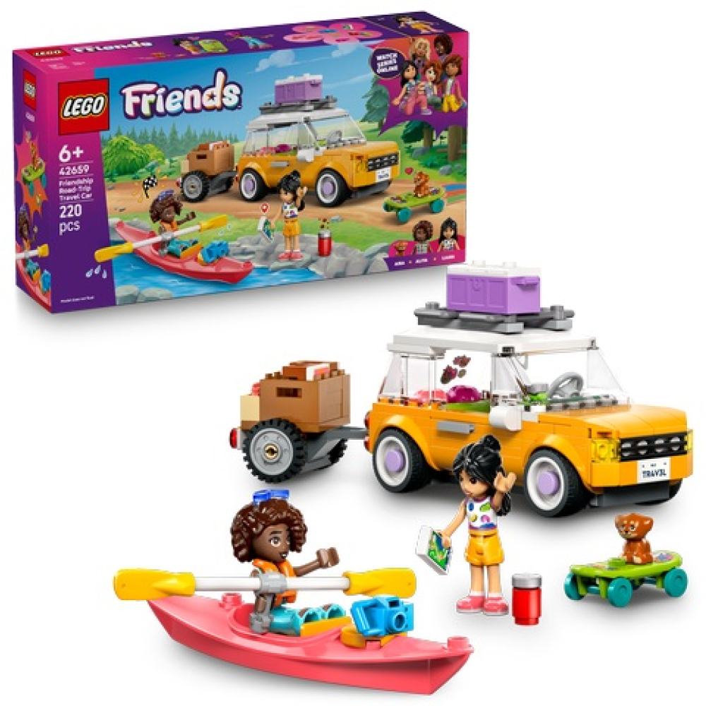 Neem kinderen mee op een creatieve reis waarin ze LEGO Friends personages Liann en Aliya helpen de LEGO auto en aanhanger in te pakken met alles wat ze nodig hebben. De vrienden zitten voorin en er is een zitplaats voor Aira de hond achter in de auto. Inclusief accessoires waaronder een kajak, 2 helmen, een mini-skateboard, skeelers, 2 stoelen en een koelbox met speelgoed eten, waaronder een broodje, donut, koekje, kersen en een traktatie voor de hond. De koelbox doet ook dienst als picknicktafel.