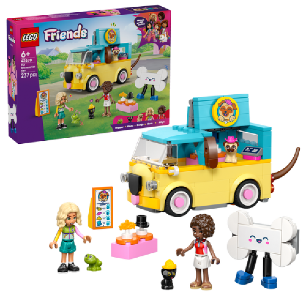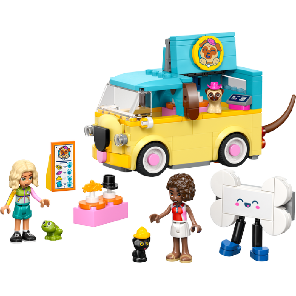 - Iedereen wordt vrolijk van de schattige LEGO Friends Bestelwagen met dierenaccessoires (42678): een voertuig in de vorm van een hond, compleet met een puppysnoetje en een kwispelende staart die beweegt als de bus rijdt