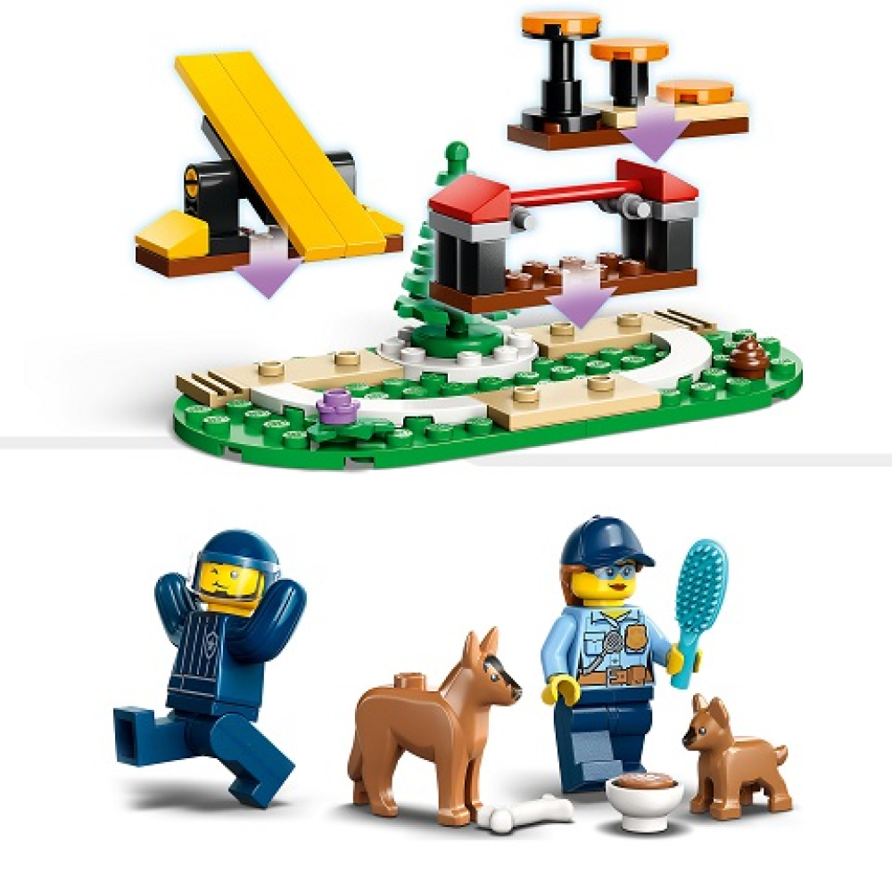 Kinderen en hondenliefhebbers zullen dol zijn op deze LEGO City Mobiele training voor politiehonden speelset. De set zit boordevol inspiratie voor fantasierijk spel en bevat een terreinwagen, aanhanger en 3 hondenspeeltoestellen: een wipwap, hindernis en stappootjes. Voeg daar de politieagenten en de figuren van een volwassen hond en een puppy aan toe en het plezier kan beginnen.