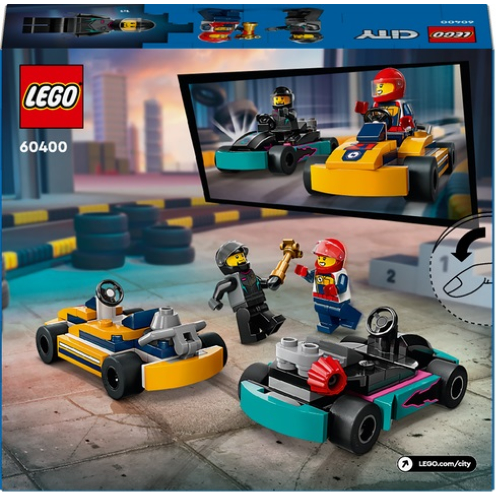 Fans van LEGO race auto speelgoed kunnen genieten van eindeloze actie met deze LEGO City Karts en racers (60400) set voor kinderen vanaf 5 jaar. Kleine racers kunnen kiezen uit 2 LEGO minifiguren van coureurs voordat ze spannende wedstrijden naspelen met de oranje en turquoise minikarts.