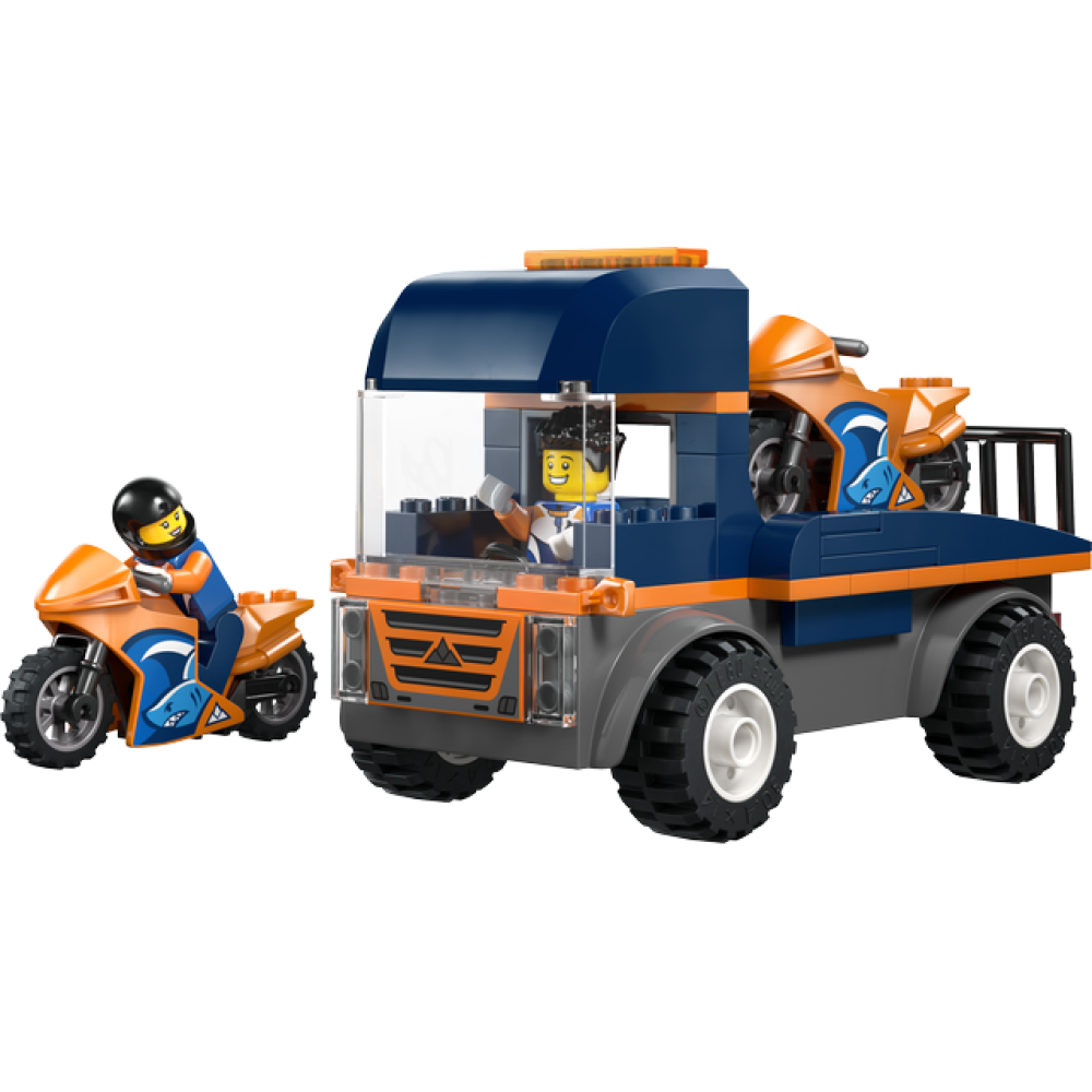 De set bestaat uit een dieplader met stevige rubberen banden, 2 sportieve speelgoedmotoren en2 minifiguren van racecoureurs met helmen. Kinderen kunnen de motoren met behulp van de oprijplaat in- en uitladen, spannende motorraces naspelen en een minifiguur in de cabine zetten voor leuke avonturen onderweg. Deze eenvoudig te bouwen speelset bev at een LEGO startsteen, instructies met simpele afbeeldingen en 3D-instructies in de LEGO Builder app – een digitale bouwpartner met zoom- en draaifuncties waarmee kinderen modellen van alle kanten kunnen bekijken tijdens het bouwen.