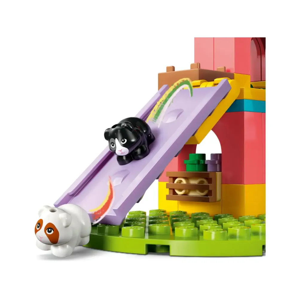 Deze LEGO dieren speelset bevat alles wat een verantwoordelijke huisdiereigenaar nodig heeft. Laat de cavia's van de glijbaan zoeven of rondjes draaien op de draaimolen. Als het tijd is om uit te rusten, help je de huisdieren om zich in het slaapgedeelte te nestelen. De set wordt geleverd met accessoires waaronder een borstel, zonnebloempitten, bladeren en een bol garen.
