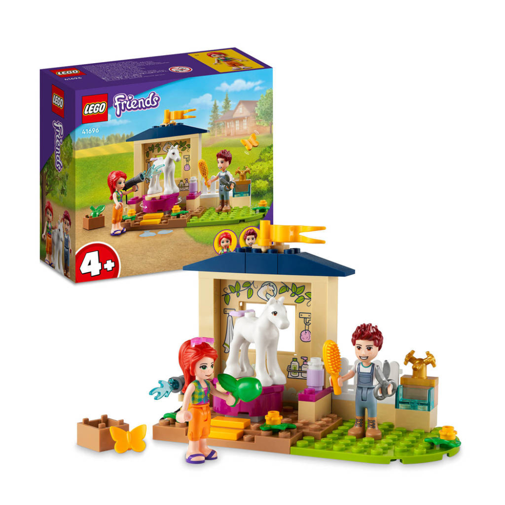 Verras kleine dierenvrienden met een heleboel LEGO Friends plezier met de Ponywasstal (41696). Met dit kleurrijke speelgoed leren kinderen vanaf 4 jaar bouwen, terwijl ze voor de paarden zorgen op de boerderij. Kinderen kunnen Mia's pony Meringue verzorgen in de paardenstal. Ze laten het paard op het ronddraaiende platform klimmen en geven haar dan een verfrissende douche. Vervolgens kunnen ze Daniel helpen om de manen van de pony te kammen en knippen, zodat ze er weer als een plaatje uitziet. Omdat Meringue zich zo goed heeft gedragen, verdient ze een appel als beloning! LEGO Friends sets hebben slimme functies voor een snelle en leuke bouwervaring. Zo bevatten ze een handige startsteen – een stevige basis waarop kinderen hun speelset kunnen bouwen. Naast duidelijke gedrukte instructies beschikt deze set ook over interactieve digitale bouwinstructies in de gratis LEGO Bouwinstructies app voor smartphones en tablets. Hiermee kunnen kinderen tijdens het bouwen op hun model inzoomen en het draaien en visualiseren. Dit leuke speelgoed met LEGO Friends minipoppetjes is een geweldig cadeau voor meisjes en jongens vanaf 4 jaar die gek zijn op paarden. Verras ze voor hun verjaardag, kerst of een andere speciale gelegenheid. Afmetingen: de ponystal is ca. 8 cm hoog, 13 cm breed en 7 cm diep Bevat 60 onderd