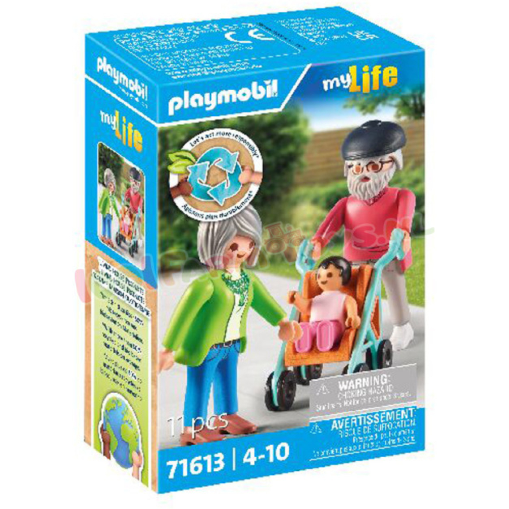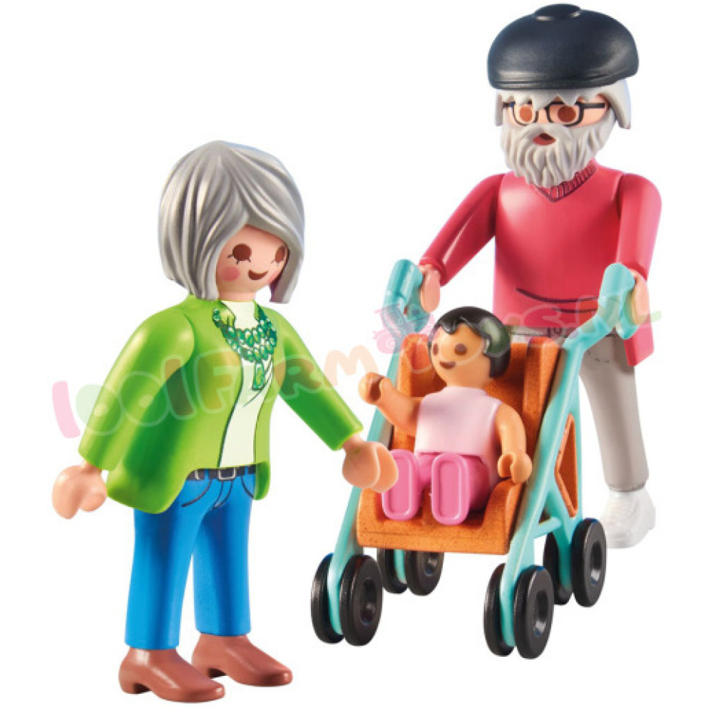 Opa en oma met kinderwagen en kleinkind. Een liefdevol ontworpen PLAYMOBIL speelset uit de themawereld Mijn Leven voor creatief rollenspel.