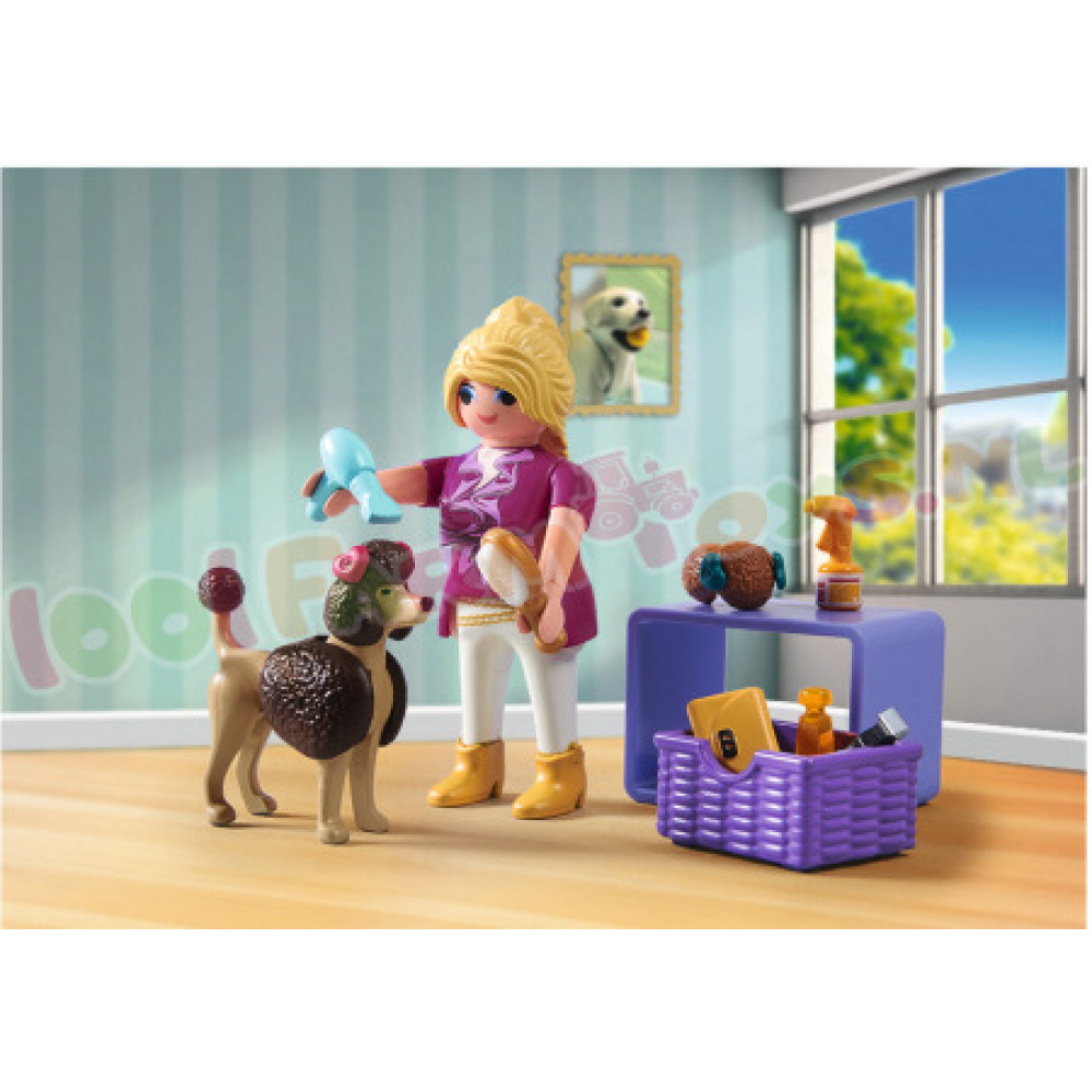 Verander verzorgingstijd in speeltijd met de PLAYMOBIL Hondentrimmer set! Style de poedel met kleurrijke vachtsets. knip en borstel zijn vacht of voeg decoratieve spelden toe voor een chique look. De poedel kan zitten. zijn kop bewegen en wisselen tussen strakke of pluizige stijlen voor eindeloos creatief plezier. De werktafel en opbergdoos houden de shampoo. föhn en trimmer binnen handbereik.
