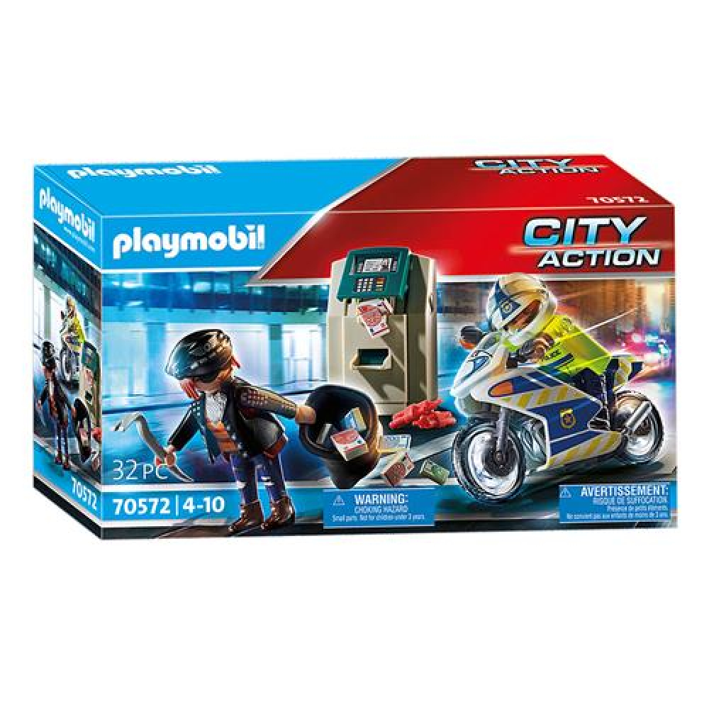 In duisternis gehuld, brak een dief in een geldautomaat, en nu vlucht hij met de buit. Maar een snelle politieagent is op zijn motor al begonnen aan de achtervolging. Deze dief zal niet ver komen! De speelset bevat twee PLAYMOBIL-figuren, een motorfiets, een geldautomaat, een koevoet, een zak, bankbiljetten en vele andere extra's.