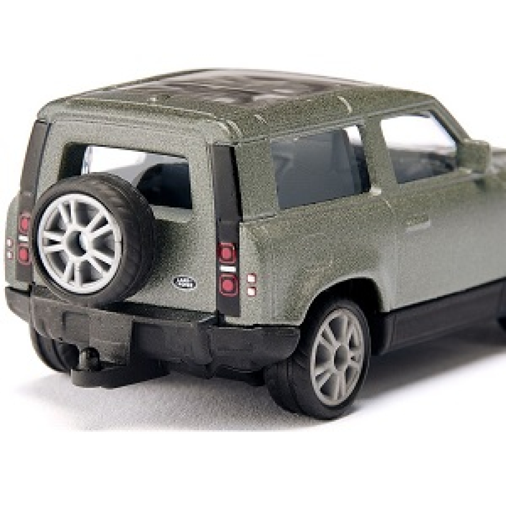 speelplaats veilig zijn weg. Het grote, doorzichtige glazen schuifdak zorgt voor een onbelemmerd zicht op het interieur van de auto. Het metallic lakwerk is in Pagena Green, beroemd bij Land Rover, en de velgen van de sportieve rubberen wielen zijn zwart. Voor noodgevallen heeft de Siku Land Rover een reservewiel achter en met standaard ingebouwde trekhaak trekt hij ook moeiteloos kleine Siku aanhangwagens en dergelijke. achter. Fans zullen het meteen opmerken de koplampen en achterlichten zijn ook getrouw gereproduceerd en gedrukt op die van de originele Defender.