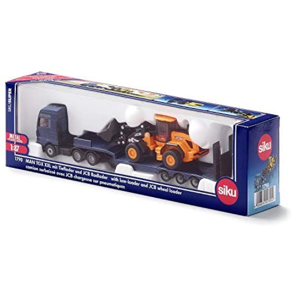 Met deze 3-assige dieplader en en de JCB wiellader kunnen kinderen doen alsof ze op de bouwplaats werken. Doordat de wiellader op de dieplader past kan deze samen met de vrachtwagen vervoerd worden. De vrachtwagen kan losgekoppeld worden van de aanhanger. De laadklep kan ook naar beneden geklapt worden. De laadschep en laadarm van de wiellader zijn te bewegen.