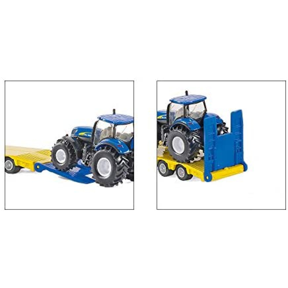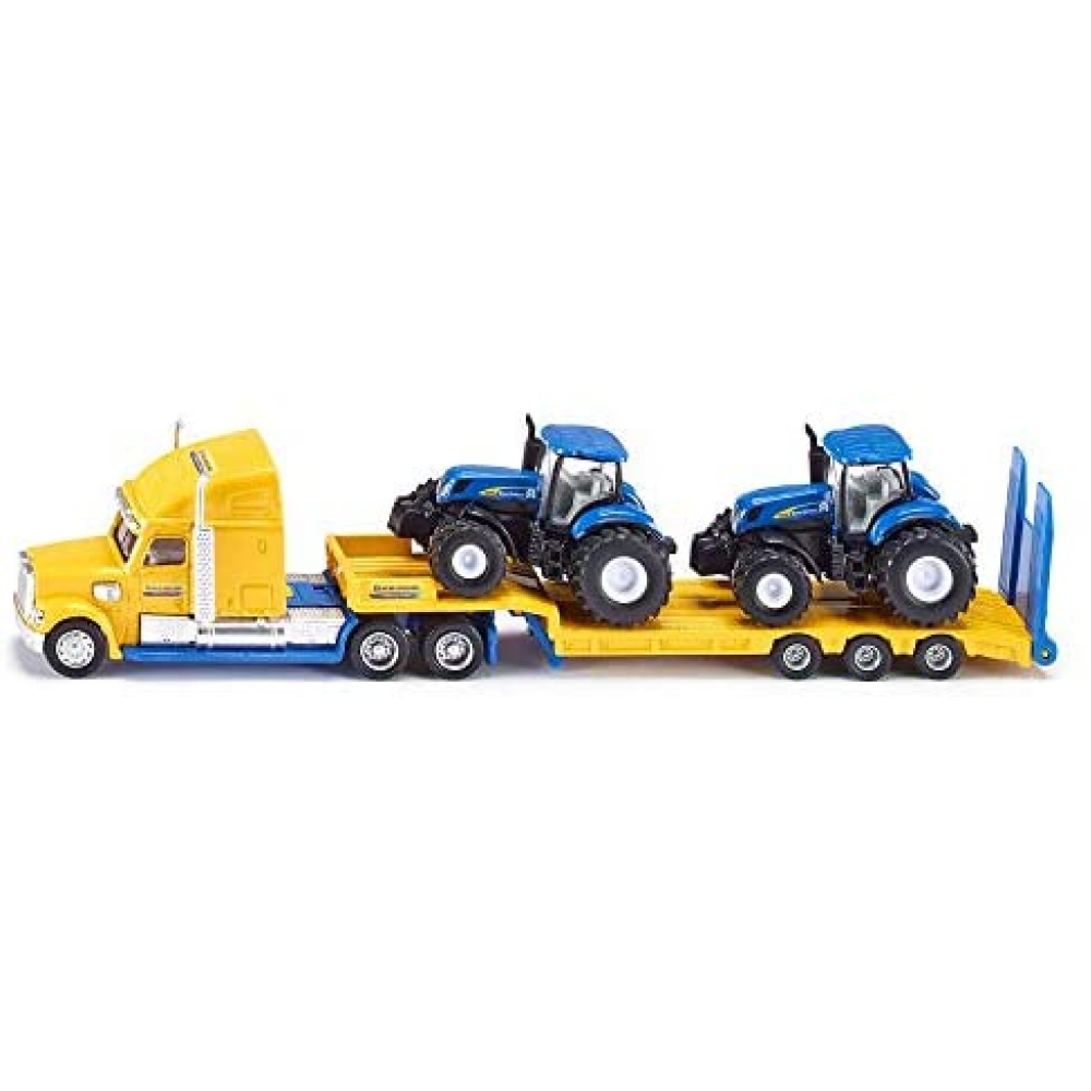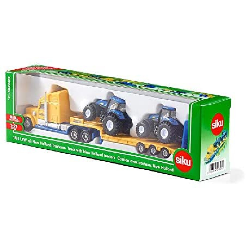 Deze stoere US-truck in het design van het wereldberoemde tractormerk New-Holland, trekt zonder problemen twee grote tractoren uit de serie T8. De modellen zijn voor het grootste deel gemaakt van metaal en uitgevoerd in de typische New Holland kleuren blauw en geel. De cabines van de tractoren zijn afneembaar. Alle voertuigen zijn voorzien van rubberbanden op velgen getrouw naar het origineel. De truck is geschikt voor kinderen vanaf 5 jaar.