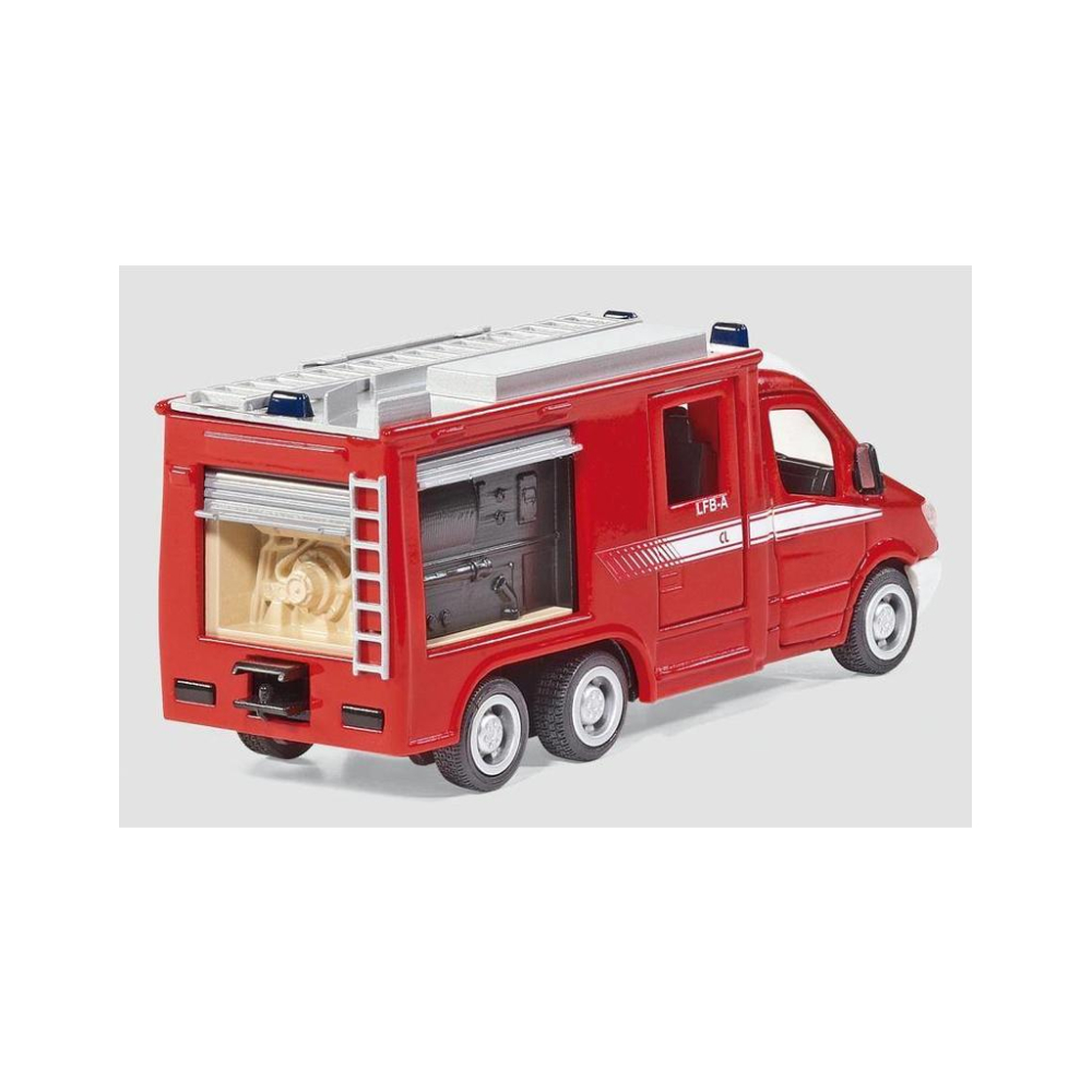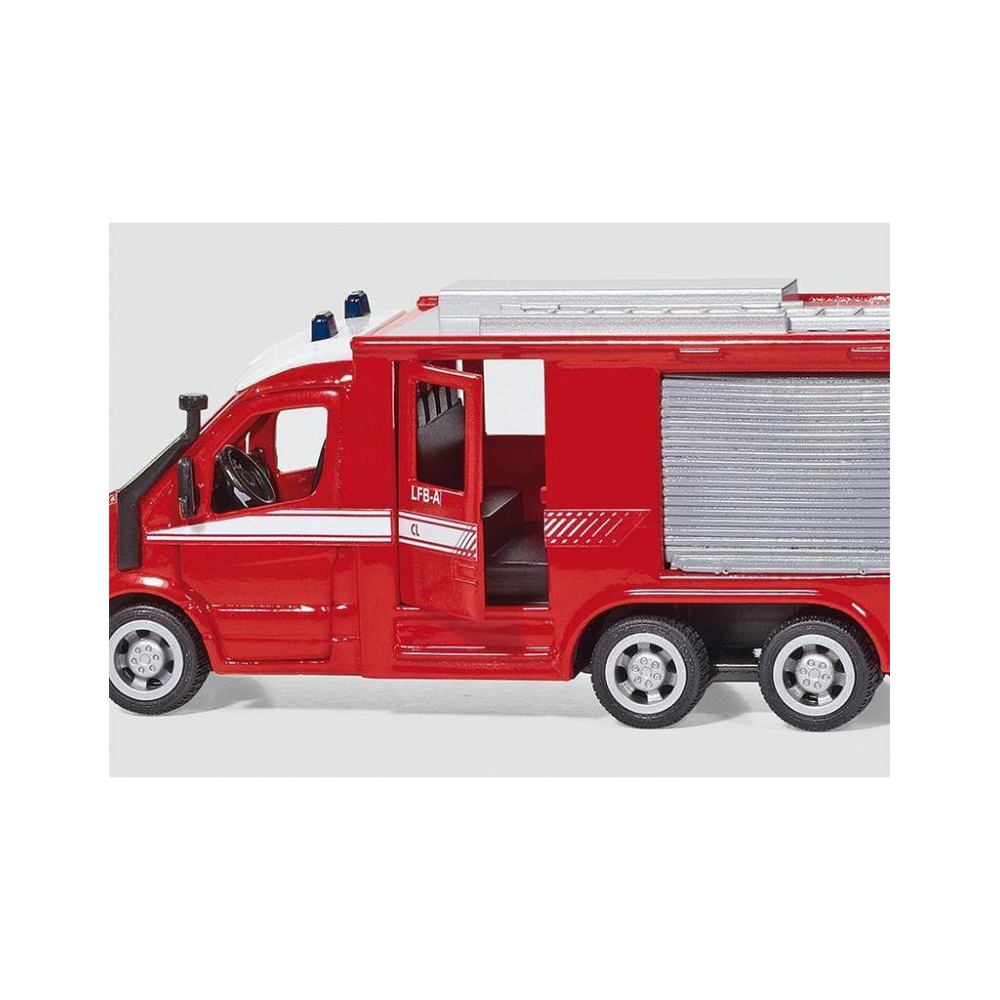 De brandweersprinter, voor de zekerheid. Met 3 assen en vierwielaandrijving is ook inzet in onbegaanbare gebieden voor dit model geen probleem. De deuren naar de chauffeurs- en manschappencabine kunnen ver worden geopend om snel uitstappen mogelijk te maken. De nieuwe rolluiken aan de zijkanten en achterin verdwijnen na het openen in de uitbouw en geven het zicht vrij op de gedetailleerde uitrusting. Afneembare ladder op het dak.