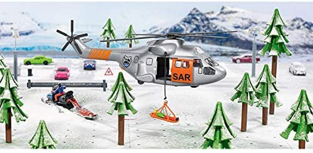 siku 2527, SAR-transporthelikopter, 1:50, metaal/kunststof, zilver, incl. brancard en speelgoedfiguur, automatisch inschuifbare lier