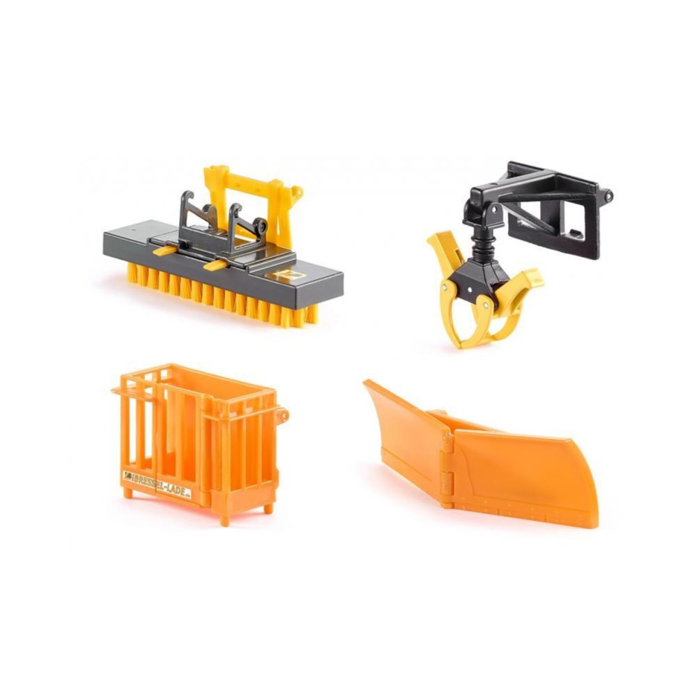De serie met aanbouwmachines voor SIKUFARMER32 tractoren met frontloader wordt met deze bijzondere set verder uitgebreid. De set bestaat uit een werkplatform, een sneeuwschild, een veger en een boomstamgrijper. Het werkplatform is bovendien voorzien van een deur. Het sneeuwschild kan naar links en rechts worden bewogen en de boomstamgrijper is voorzien van een pendelend opgehangen grijper. Een bijzonderheid van de veger is dat deze op de meegeleverde palletvork kan worden geschoven.