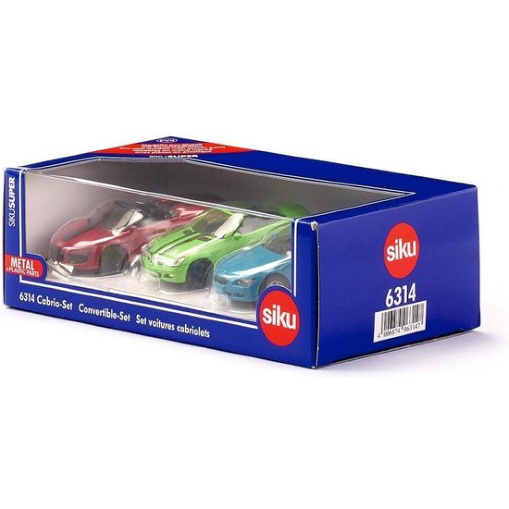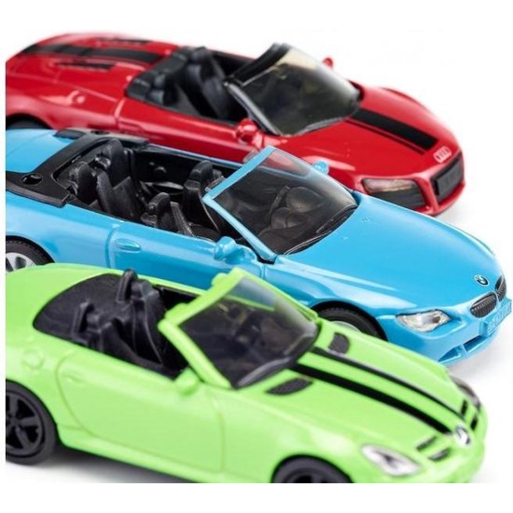 Siku giftset cabrioDe eerste zonnestralen in de lucht: hartstochtelijke cabriorijders kunnen dit prachtige moment nauwelijks afwachten. Het is natuurlijk nog mooier wanneer er keuze is uit drie modellen: Mercedes SLK, Audi R8 Spyder en BMW 645i. Drie auto's met elk een eigen karakter. De Mercedes is een sportieve roadster. De groene lak en de twee strepen geven de ambitie aan. De Audi R8 is een compromisloze racer. Dit komt duidelijk naar voren in de rode lak en de twee strepen. De 10-cilinder motor accelereert de tweezitter uit Neckarsulm naar de 313 km/uur. De BMW 645i is weer geheel anders: Hij is ondanks het ruime V8-motorvermogen van 333 PK eerder een gemoedelijke cruiser – wel met een tempo van 250 km/uur. Van het lichtblauw gelakte model kan de zwarte kap worden verwijderd.